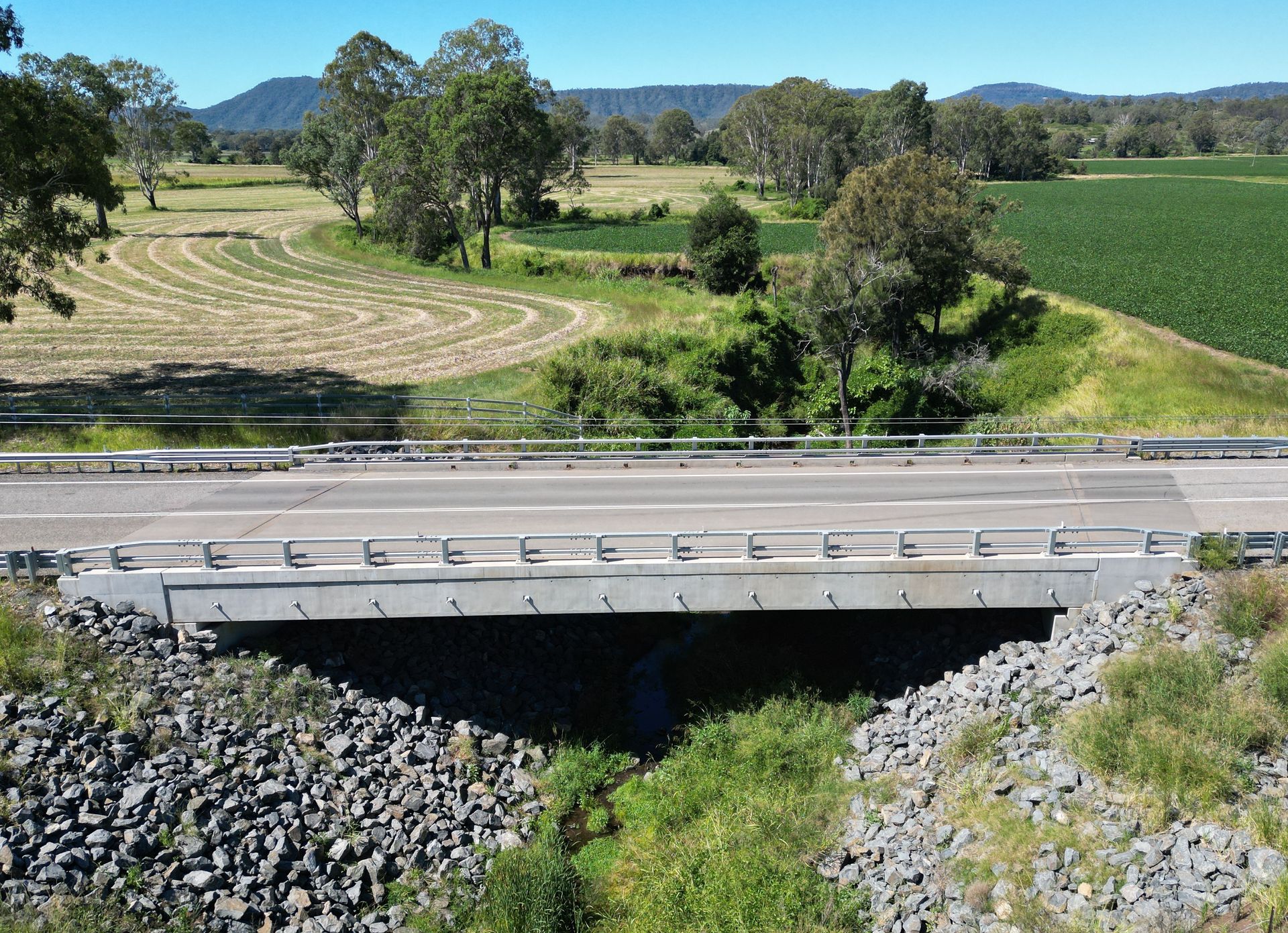 Project management included preparation of Development Applications for 2 bridges, land acquisition negotiations, utilities relocations, design management, construction management and program reporting and claims. Significant project challenges included changes to the bridge code in 2017 for flood loading provisions, encountering extremely hard rock requiring an imported drill head and increased bridge lengths to meet a change in the interpretation of the Fisheries requirements. Our team was successful in securing additional funding from the Australian Government through the Bridges Renewal Program due to these changes.